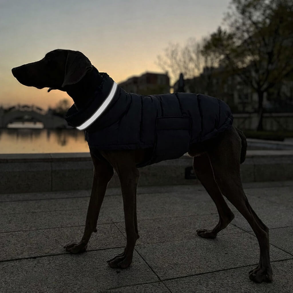 Wärmender Hundemantel für frierende Hunde mit wasserabweisendem Außenstoff, reflektierenden Details & verstellbarer Passform.