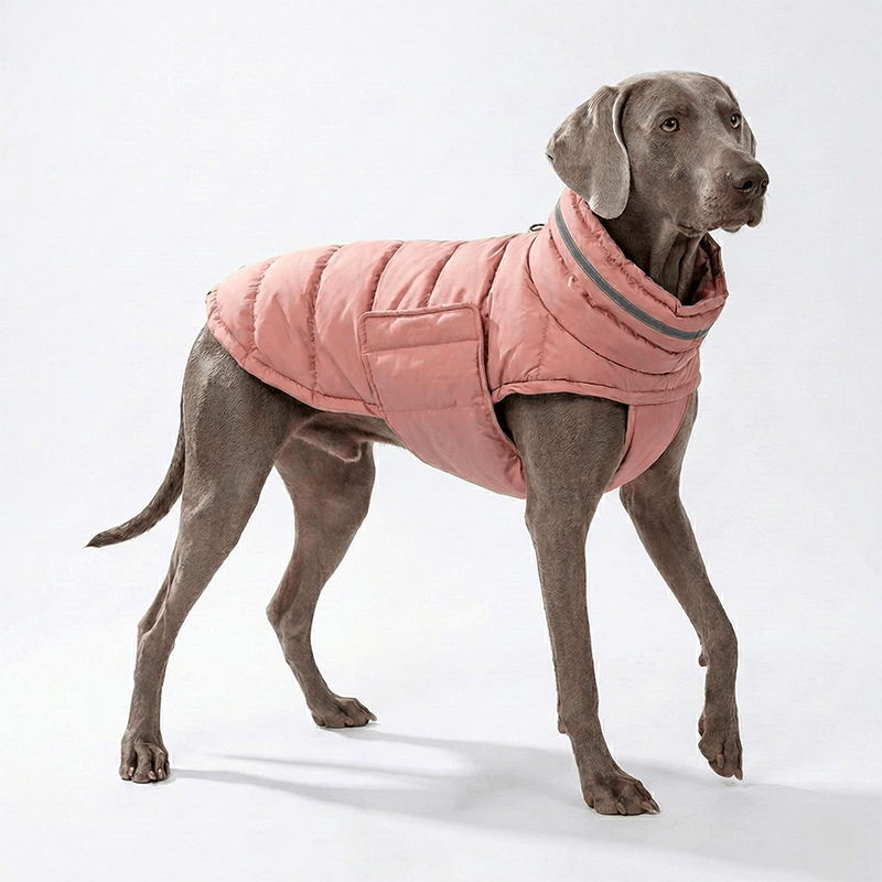 Stilvoller Hunde Wintermantel "Juneau" in elegantem Rosa für zuverlässigen Schutz vor Kälte und Nässe. Dank des weichen Innenfutters und der optimalen Passform genießt dein Hund maximale Bewegungsfreiheit bei jedem Winterabenteuer.